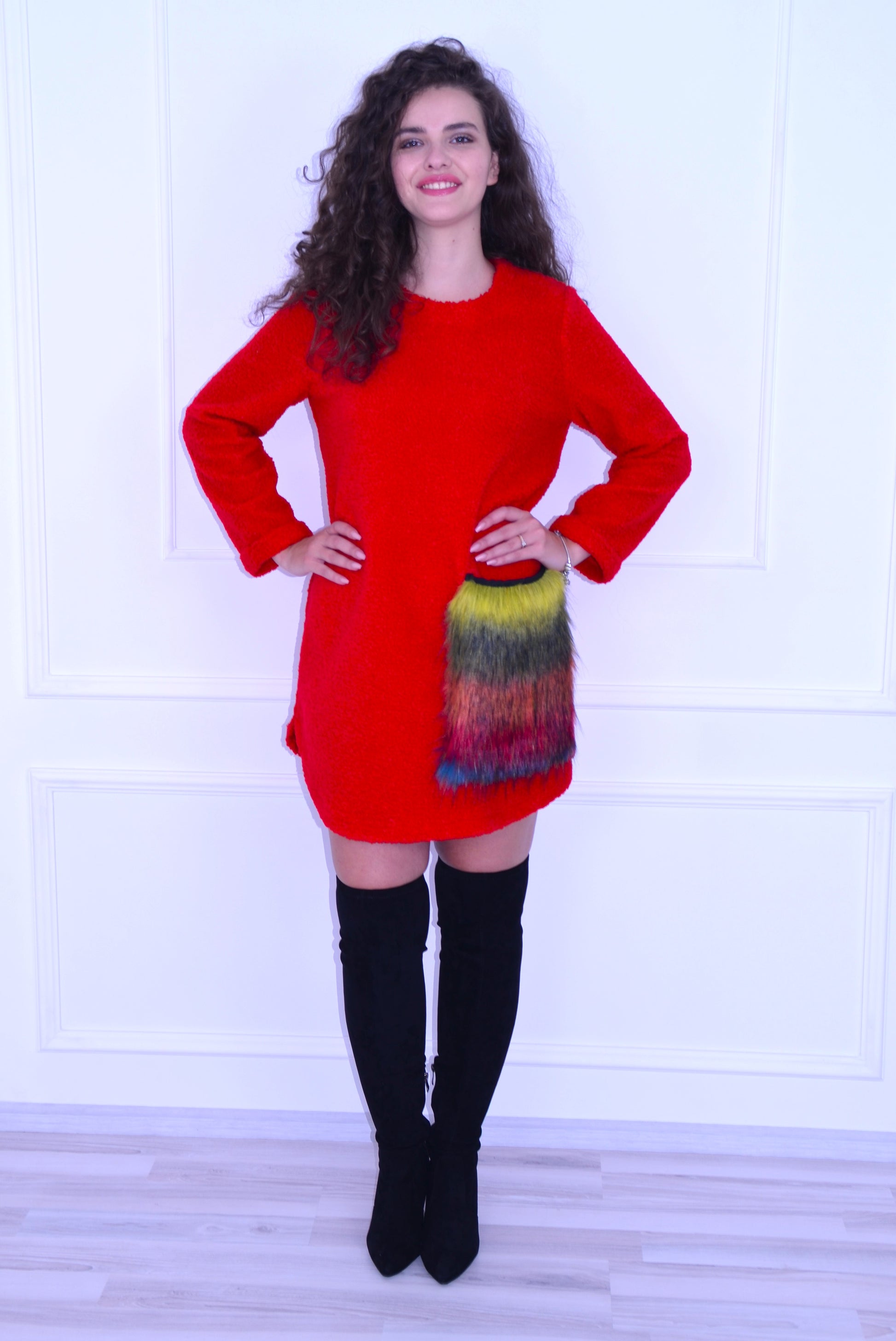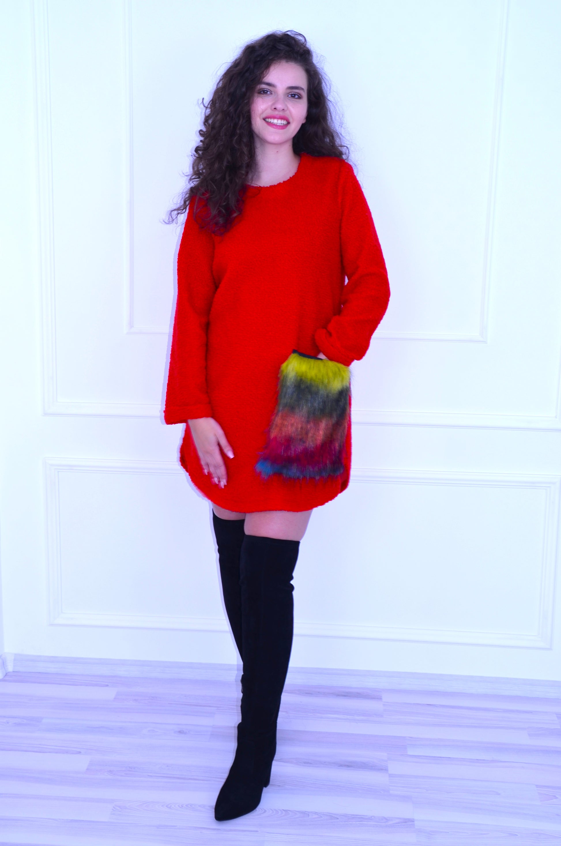 Rochie tip sarafan cu buzunar aplicat din blana, se poate purta ca si pulover, din material Boucle, foarte pufos. Ideală pentru sezonul rece.