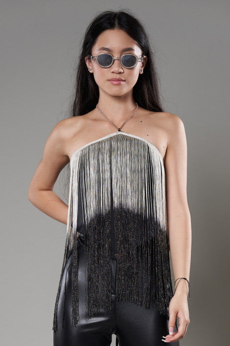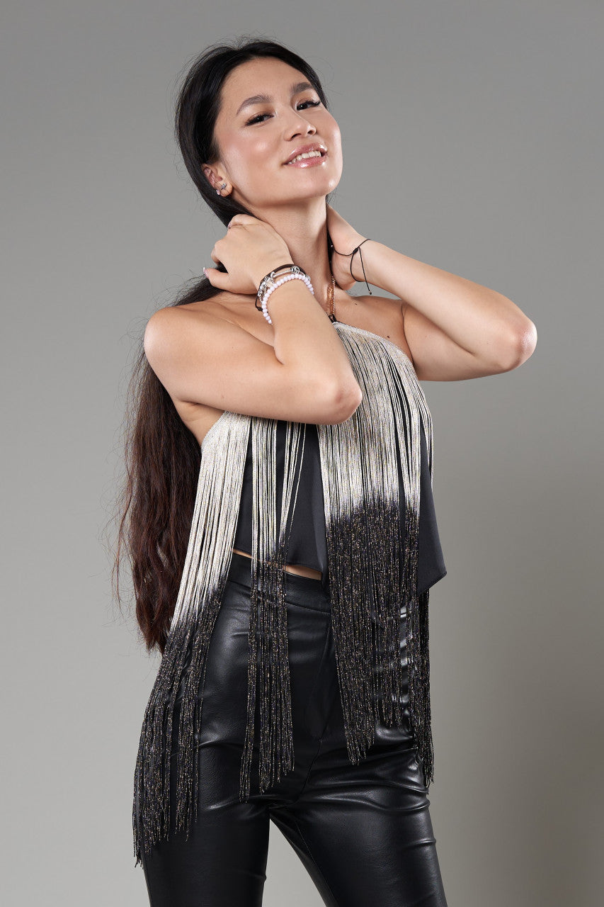 op deosebit, confecționat în culoarea negru și accesorizat cu franjuri albe și negre, sclipitoare. Realizat dintr-un material confortabil și plăcut la atingere.